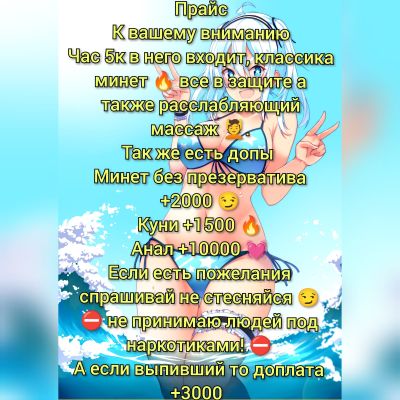 Невероятно нежная милая, ????Встречи???? 6 час классика минет в презервативе???? Есть доп услуги, минет без презерватива, анал ????, Куни ????. Допы обговариваются отдельно ????. ????Не принимаю людей под наркотиками ???? ????Для выпивших час 7к???? ❤ЖДУ ТОЛЬКО ТЕБЯ❤